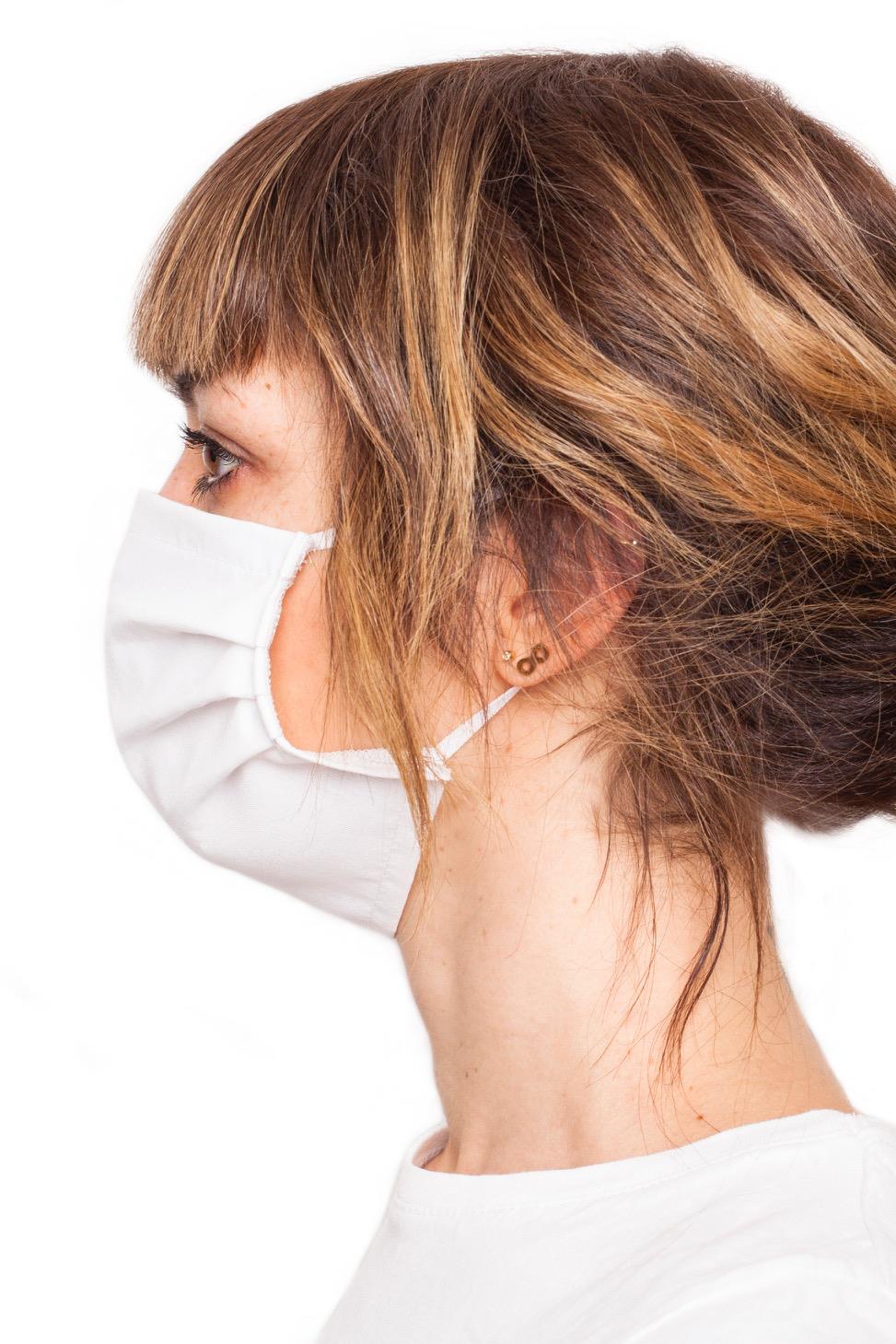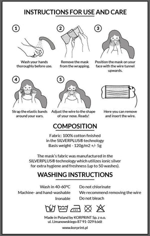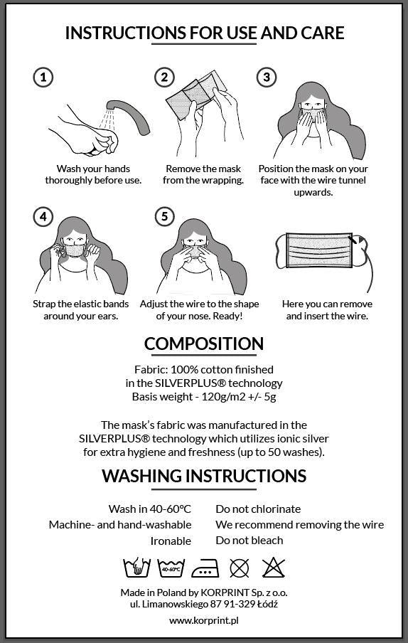 Individual 2-ply reusable face mask. 100% Cotton. Shapeable nose wire which can be removed for washing. Mask is made with 2 layers of cotton topped with *Silverplus technology which utilizes iconic silver for hygiene and protection against particulates and droplets. Guaranteed protection for up to 50 washes. National Institute of Public Health certified product. One size.