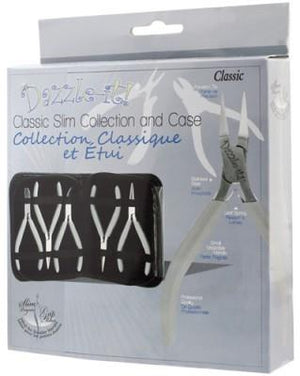 5 piece kit w/folding, zip-up case, 5.3" x 5.9" x 1.2", (13-1/2 cm x 15 cm x 3 cm). Classic slim collection. Side cutter pliers, round-nose pliers, flat-nose pliers, bent-nose pliers, and chain-nose pliers. All are 4.75", (12.06 cm), long, stainless steel. All have leaf spring, and small grapple handle.