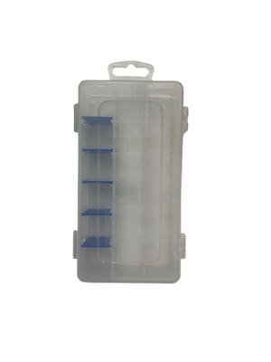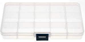 Tackle stowaway box. Adjustible compartments, (5 to 15). Clear plastic. Box measures, 17.6 cm x...