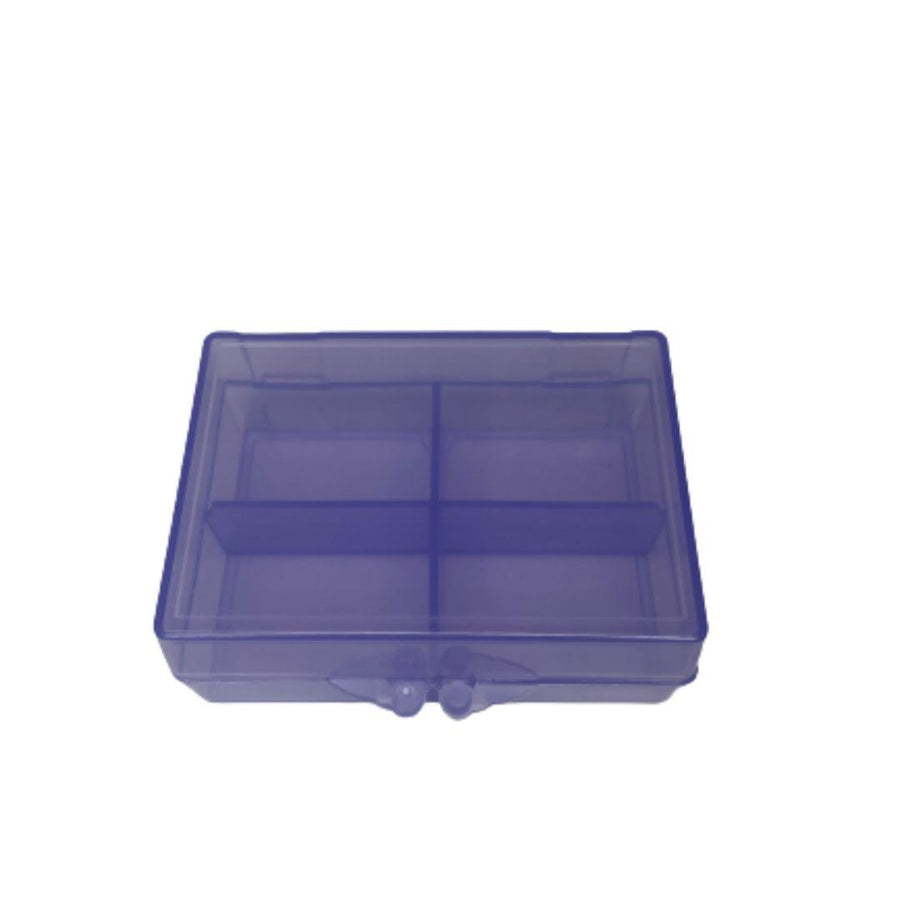 Stackable, 6 fixed compartment box. Comes in various colours, with clear plastic lid.