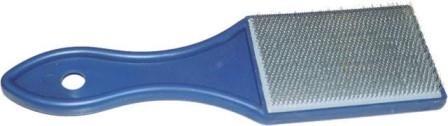 3"x2", (7.5 cm x 5 cm), blue plastic file cleaner, w/short wire bristles. W/paddle handle.