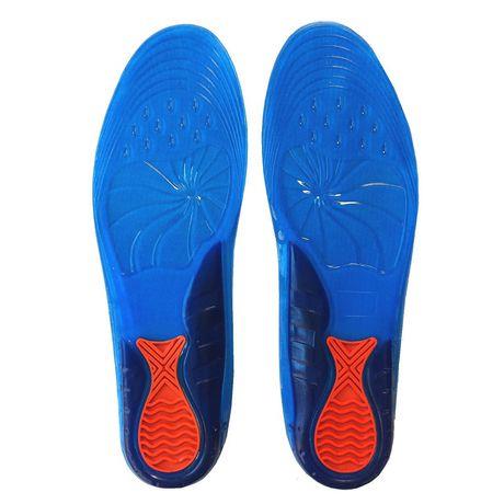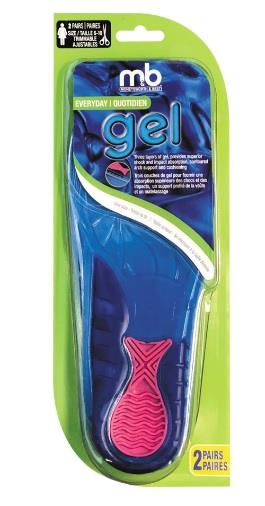 2 pack of gel insoles. Ladies size 4-10 with guidlines for cutting down to size. Cushioning for your active lifestyle! Offers three layers of gel to provide superior shock and impact absorption. The fabric top cloth has a moisture wicking system to keep feet dry and help reduce odour. Thin design fits in most shoes.