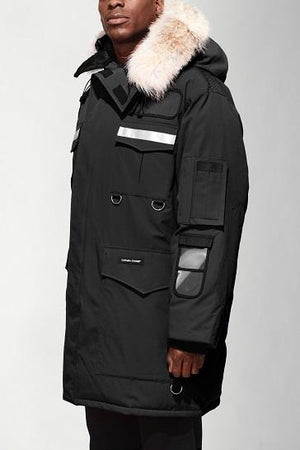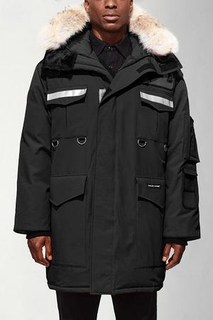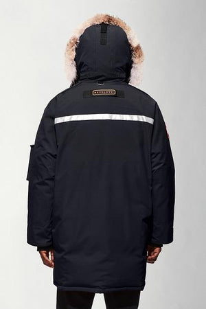 The Resolute parka has long been known as the industrial parka of the north and is geared towards extreme weather conditions. Made longer to protect thighs from extreme cold and completed with 625 fill power white duck down insulation, this iconic Canada Goose jacket is the definition of warmth. Features: double reinforced elbows, a down filled hood with adjustable rim, reflective strips on the back and front and d-ring attachements on the hood and front pockets to allow you to hang gloves or get to other necessary items. Also equipt with a down filled wind skirt, drawcord waist, fleece lined pockets to keep your hands cozy. Come in black and navy.