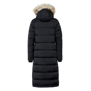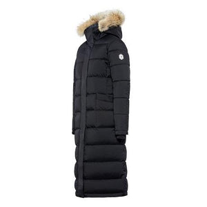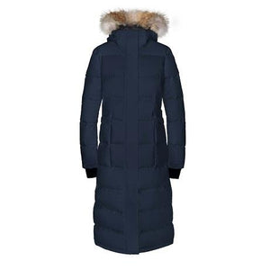Quartz Co. ladies "Ajna" down winter jacket has a semi-slim fit with a 7/8 length. Features an adjustable fixed hood with removable Canadian coyote fur. Two-way zipper closure and snap buttons placket at front to keep the cold wind at bay. Two deep, zippered front pockets to keep the necessities at hand.