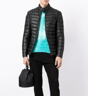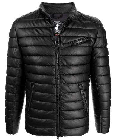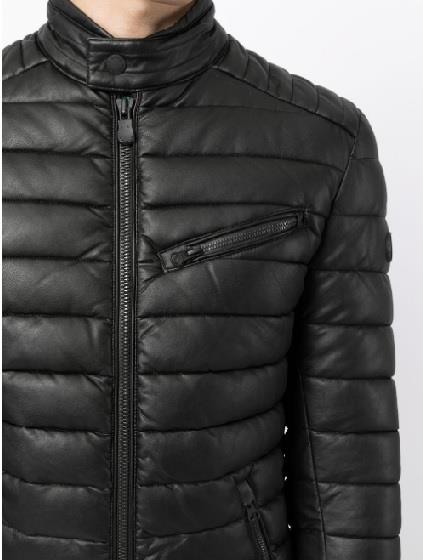 This sleek vegan leather quilted moto jacket is a fashionable add on to your winter lineup. No hood. 3 exterior pockets. 2-way zipper. 58% Polyurathane 42% Viscose. High wind and water repellancy. Front left chest pocket was changed to a zippered hidden pocket for a smoother look.