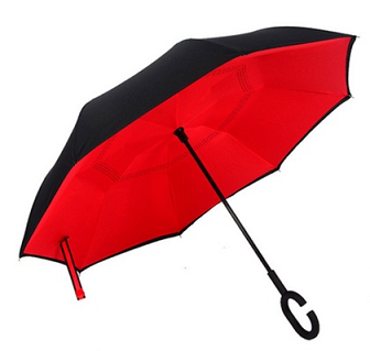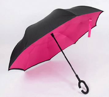 An umbrella for the 21st century. Your forearm fits through the loop in the c-shaped handle leaving both of your hands free, so you can easily answer your phone while still holding your coffee (admit it, you've been there). It's free-standing when collapsed, allowing excess water to drip away quickly. "Inverted" design means this umbrella collapses toward the tip rather than the handle. The two-tone design is black on the outside, with a pop of colour on the inside.